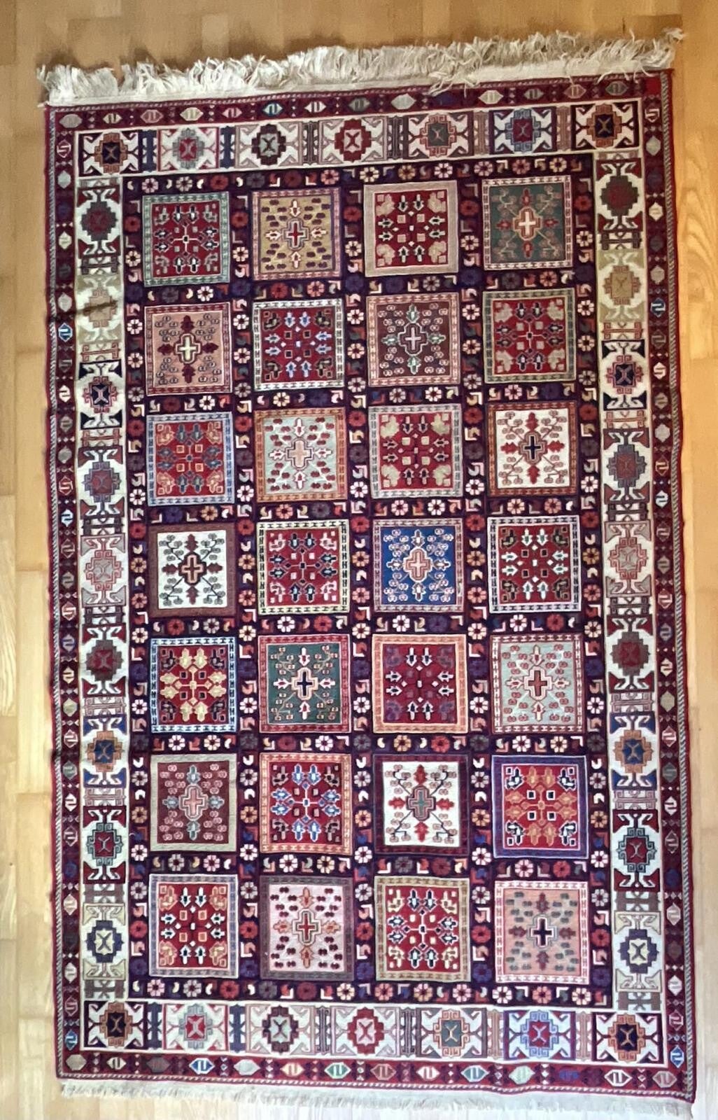 Verni carpets fall under the same category as kilim, Verni carpets have distinctive characteristics that set them apart from within this category. While both Kilim and Verni carpets are woven without pile (meaning they are flat-woven), Verni carpets specifically use a tapestry technique unique to certain regions of Iran known for patterns featuring stylized animals, motifs and intricate designs that differ slightly from typical Kilim patterns.