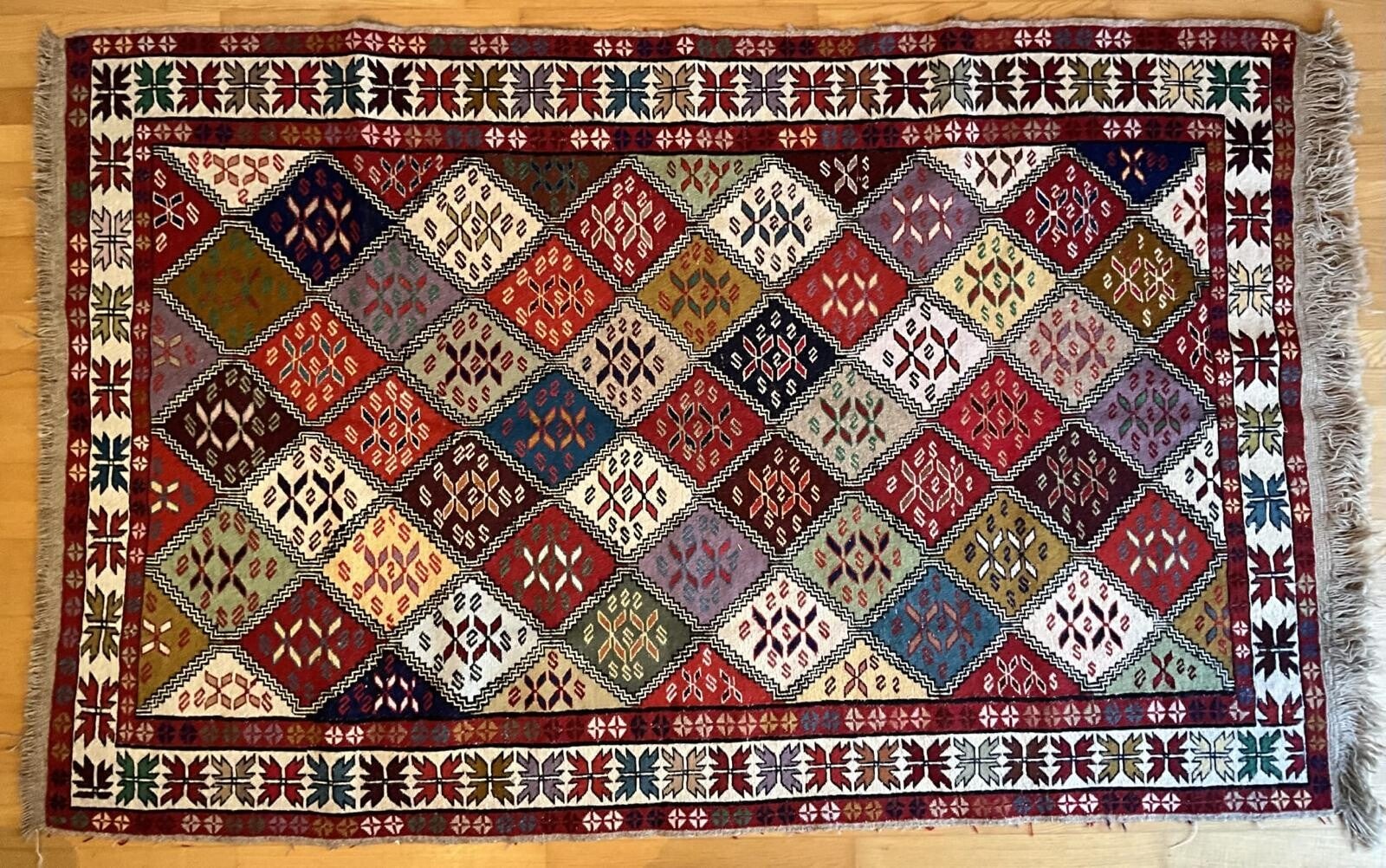Verni carpets fall under the same category as kilim, Verni carpets have distinctive characteristics that set them apart from within this category. While both Kilim and Verni carpets are woven without pile (meaning they are flat-woven), Verni carpets specifically use a tapestry technique unique to certain regions of Iran known for patterns featuring stylized animals, motifs and intricate designs that differ slightly from typical Kilim patterns.